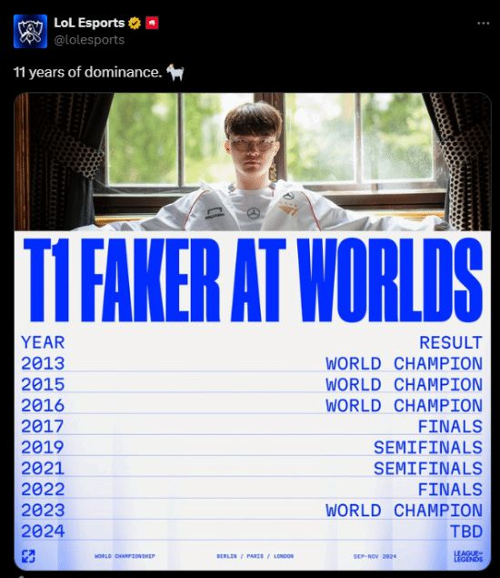 《英雄联盟》官推今日发文晒出T1选手晒Faker历届世界赛成绩:11年统治级表现,史上最佳。竞技宝app下载